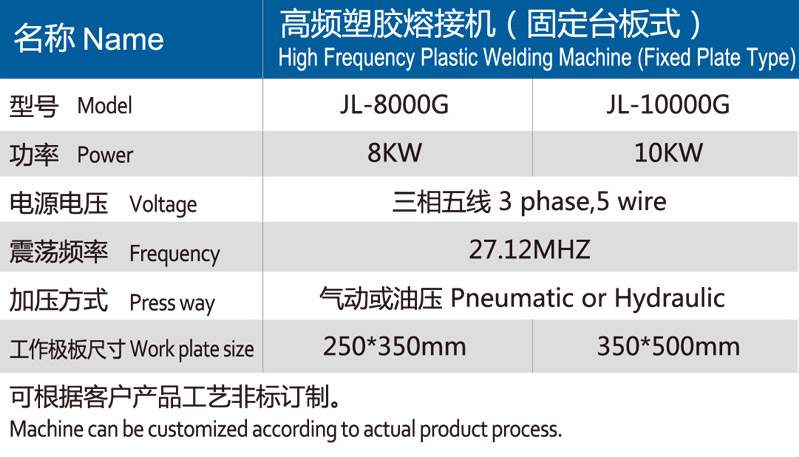 - 【設備功能及用途】 ※ 本設備適用于吸塑泡殼+紙卡,pvc雙泡殼熔接切邊,PET/APET/PETG/GAG熔斷 ※ 設備穩定高產,提高工作效率,節省人工成本 ※ 裝置高靈敏度NL5557火花防止器,有效防止損壞模具 ※ 穩定耐用電子管,低耗的振蕩電路,輸出穩定可靠 ※ 焊接強度高,適合大中小廠家生產需求