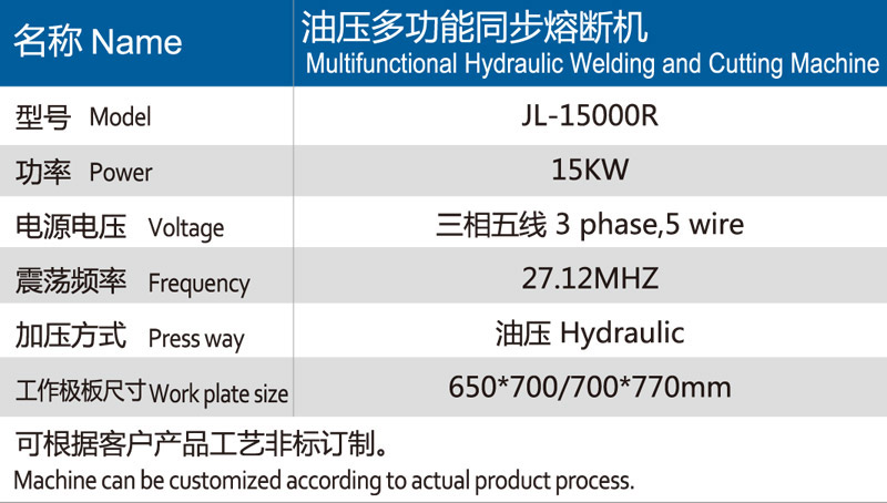 - 【設(shè)備功能及用途】 ※ 本設(shè)備適用于吸塑泡殼+紙卡,pvc雙泡殼熔接切邊,PET/APET/PETG/GAG熔斷 ※ 設(shè)備穩(wěn)定高產(chǎn),提高工作效率,節(jié)省人工成本 ※ 裝置高靈敏度NL5557火花防止器,有效防止損壞模具 ※ 穩(wěn)定耐用電子管,低耗的振蕩電路,輸出穩(wěn)定可靠 ※ 焊接強度高,適合大中小廠家生產(chǎn)需求
